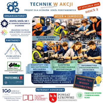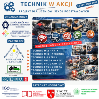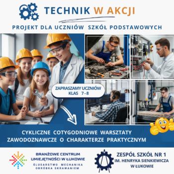 Zespół Szkół Nr 1 im. Henryka Sienkiewicza w Łukowie we współpracy z Branżowym Centrum Umiejętności w Łukowie realizuje projekt „Technik w Akcji” – cykl warsztatów zawodoznawczych skierowanych do uczniów klas VII–VIII szkół podstawowych. Celem przedsięwzięcia jest wsparcie młodzieży w… Czytaj dalej »