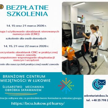Branżowe Centrum Umiejętności w Łukowie, działające w obszarze ślusarstwa, mechaniki, obróbki skrawaniem, zaprasza do udziału w specjalistycznych szkoleniach: Obsługa i użytkowanie obrabiarek sterowanych numerycznie (CNC) – szkolenie dla osób dorosłych – 14, 15 oraz 21 marca 2026 r. Wykorzystanie… Czytaj dalej »
