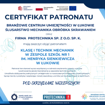 W dniu 21 października 2025 roku uczniowie klasy I Technikum Mechanicznego z Zespołu Szkół Nr 1 im. Henryka Sienkiewicza w Łukowie wzięli udział w pierwszej wizycie studyjnej w firmie PROTECHNIKA Sp. z o.o. sp. k. z siedzibą w Dębowicy. Wizyta… Czytaj dalej »