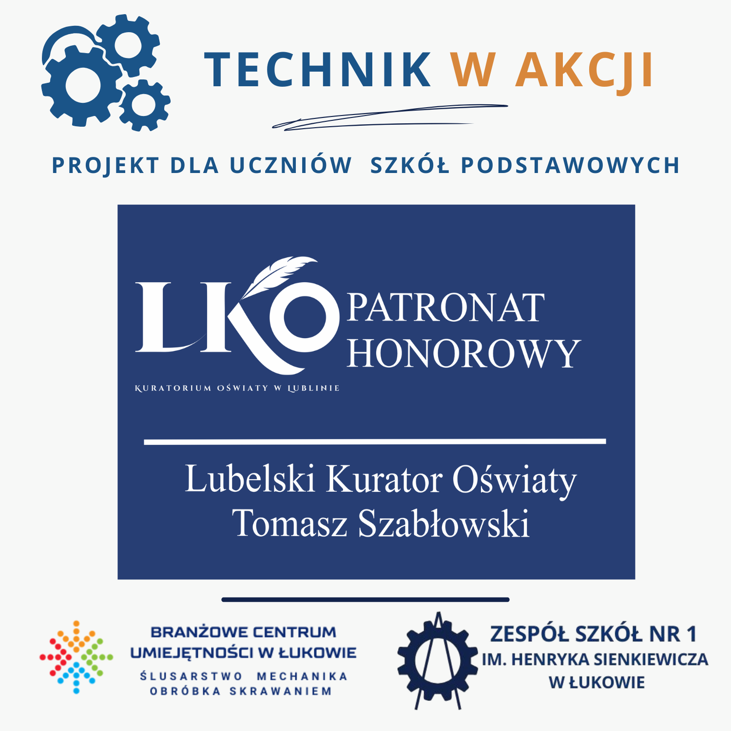Lubelski Kurator Oświaty objął patronatem projekt edukacyjno-zawodoznawczy „Technik w Akcji”, realizowany przez Branżowe Centrum Umiejętności w Łukowie we współpracy z Zespołem Szkół Nr 1 im. Henryka Sienkiewicza w Łukowie.