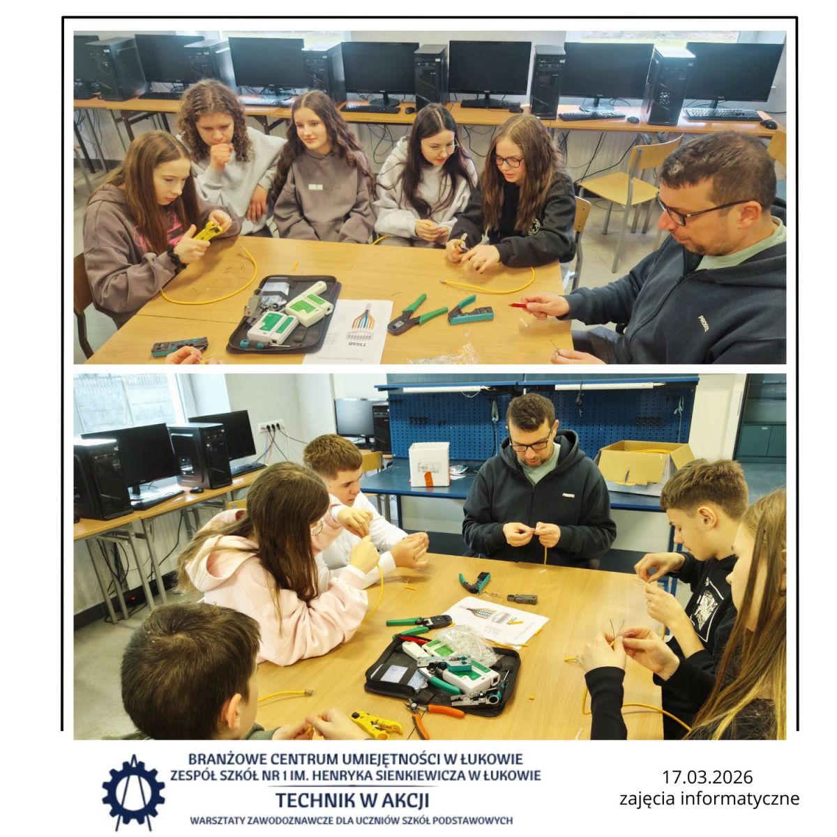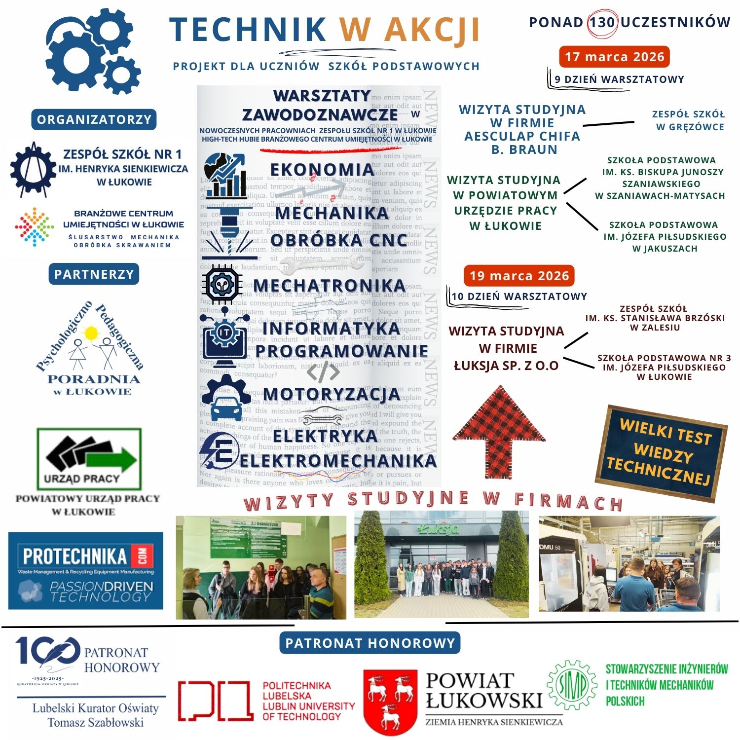 W trzecim tygodniu marca 2026 r. uczniowie klas VII–VIII szkół podstawowych z terenu Powiatu Łukowskiego wzięli udział w kolejnej edycji projektu edukacyjno-zawodoznawczego „Technik w Akcji”. Program obejmował wizyty studyjne w przedsiębiorstwach oraz instytucjach rynku pracy, a także modułowe warsztaty realizowane w Branżowym Centrum Umiejętności w Łukowie oraz Zespole Szkół Nr 1 w Łukowie.