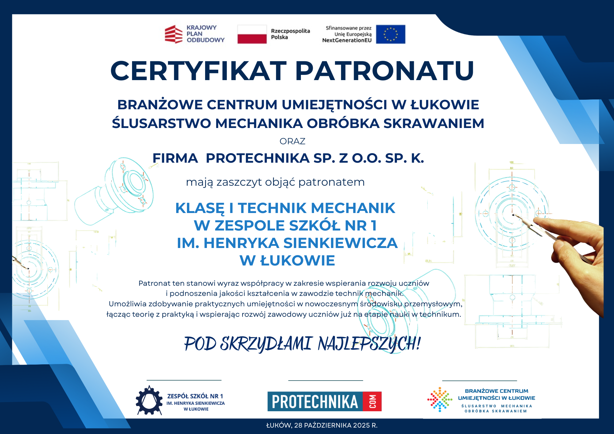 28 października 2025 roku odbyła się uroczysta inauguracja klasy patronackiej Technikum Mechanicznego w Zespole Szkół Nr 1 im. Henryka Sienkiewicza w Łukowie. Wydarzenie miało miejsce w Branżowym Centrum Umiejętności (BCU) w Łukowie podczas ogólnopolskiej konferencji pt. „Produktywność procesów wytwórczych w branży metalowej”